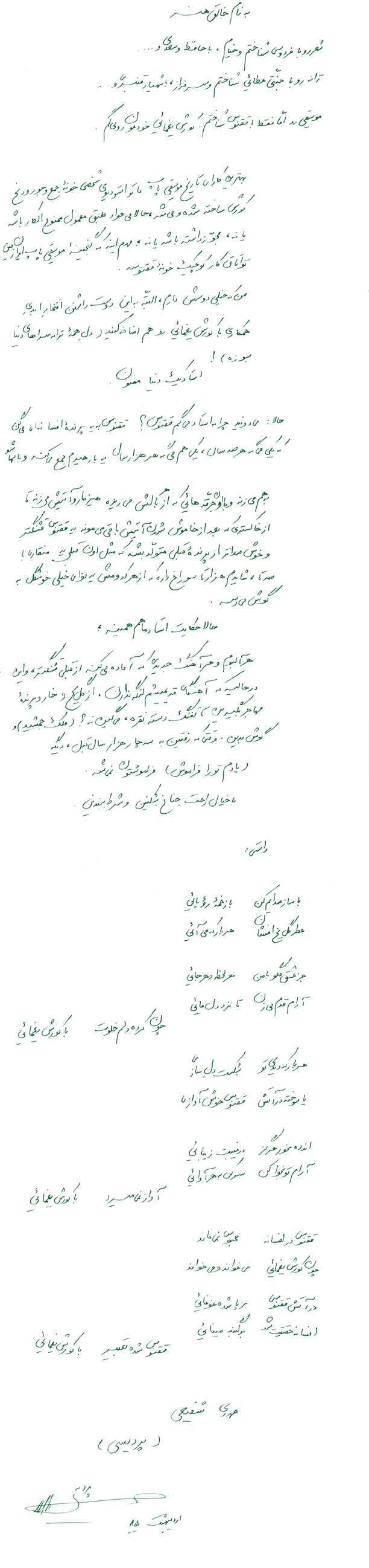 جز عشق مگو با من ، هر لحظه و هرجائی آرام قدم می زن ، تا نزد دل مائی چون کرده د لم خلوت ، با کورش یغمائی هر بار که د یدی تو ، بشکست دل سازی یاسوخته در آتش ، ققنوس خوش آ وازی